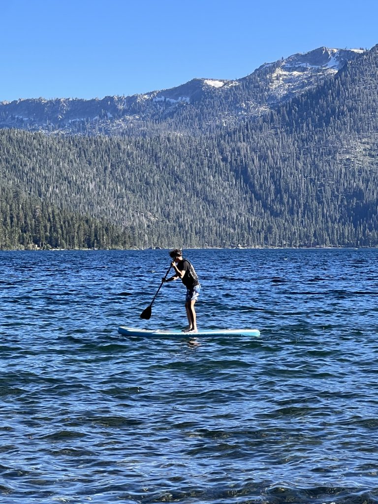 After we completed our scenic drive around the lake,  about five miles past Camp Richardson, we drove into Fallen Leaf Campground. Similar to the campground inside Yosemite, when you picture in your head a place to “camp in the woods”, this place here is the perfect picture. This place is a wonderful place to get away and camp in the woods. Very spread out sites but close enough for comfort. Magnificent trees everywhere and the paved roads made it easy to drive and ride around. Another reason we chose to stay here was because this place has its own lake! We brought our paddle board along just to use it here; three out of the four of us had enough courage to get into the freezing water. Based on this last comment, can you tell who didn’t make it in? Yup! Too cold for my liking. But I loved seeing my husband and kids fall off of the board and completely submerge in this beautiful snow runoff lake.