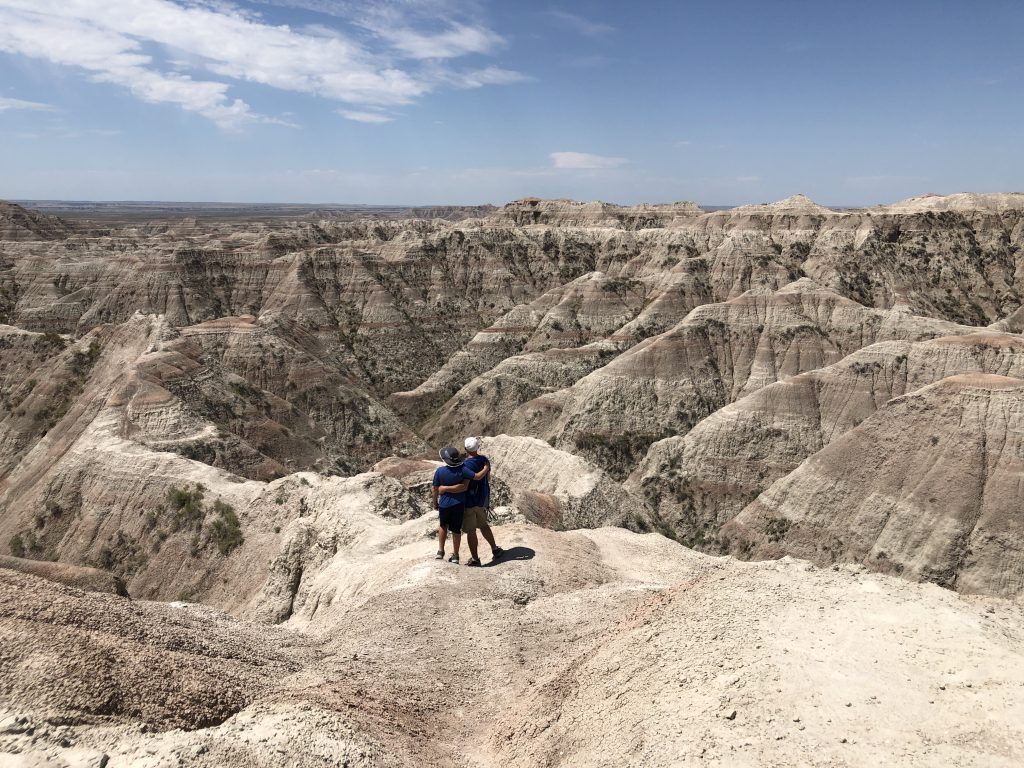 Heading out of beautiful Utah, we proceeded to make our way to South Dakota next. We had an all day driving day but there are absolutely no Cracker Barrels in this part of the country so we ended up spending the night in a  parking lot at a gas station surrounded by trucks so we wouldn’t feel alone. It wasn’t our best night sleep ever so we would have liked to find a campground instead but there weren’t many options around the time we hit our 500 mile mark that put us near Rawlins, WY. Up Bright and early, we continued along. Before we left, a coworker said we just had to visit the Badlands since we were heading up there and we are so glad we did! This place is soo cool! We made it here about six hours later and Jacob got us in for free with his pass. We drove around and stopped at various spots to get a closer look. The boys enjoyed hiking down inside of it as the girls stayed back and watched. Now we can say we’ve been there and we got the T-shirt 🙂