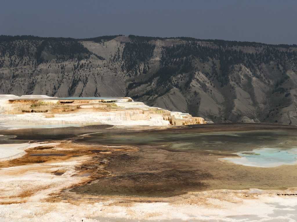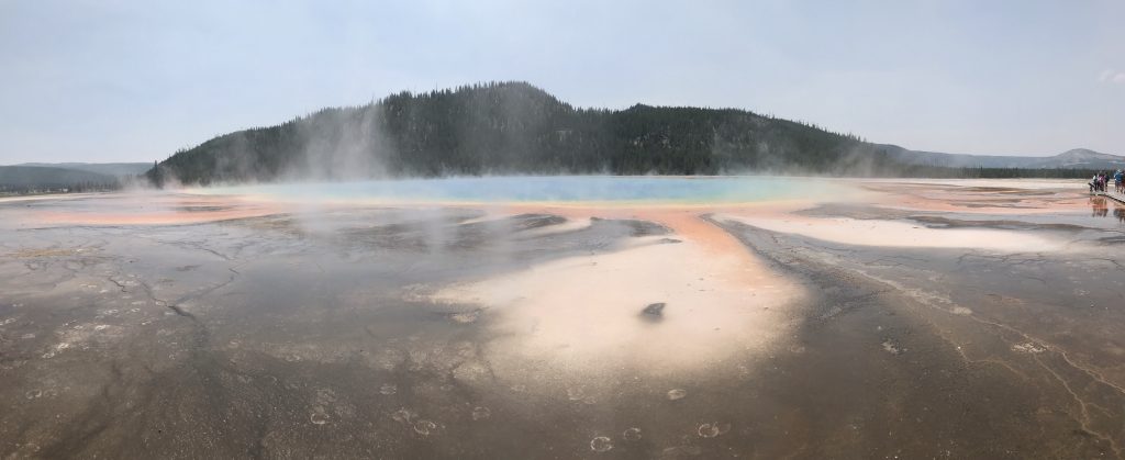 We are now on day ten of this trip, after a nice breakfast, we packed up and hit the road visiting others must see: very pleasing to the eyes, but not to the nose. The smell of rotten eggs hits you hard even if you are inside! The natural sulfur in that region is the culprit so just be prepared to keep your eyes open and  plug your nose as you drive through that part of this park.  We spent the rest of the day just stopping along the road at the many scenic sites to marvel at the natural beauty this park has to offer: from the sulfur mountains, pond springs, waterfalls, and even the very famous Grand Prismatic Spring.