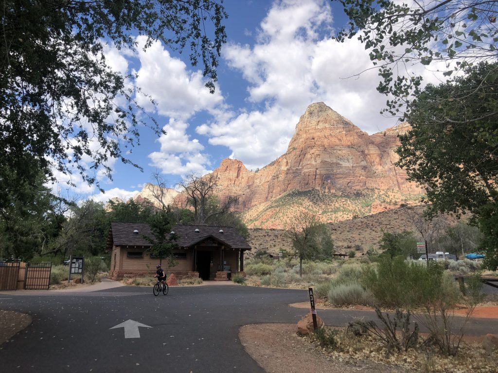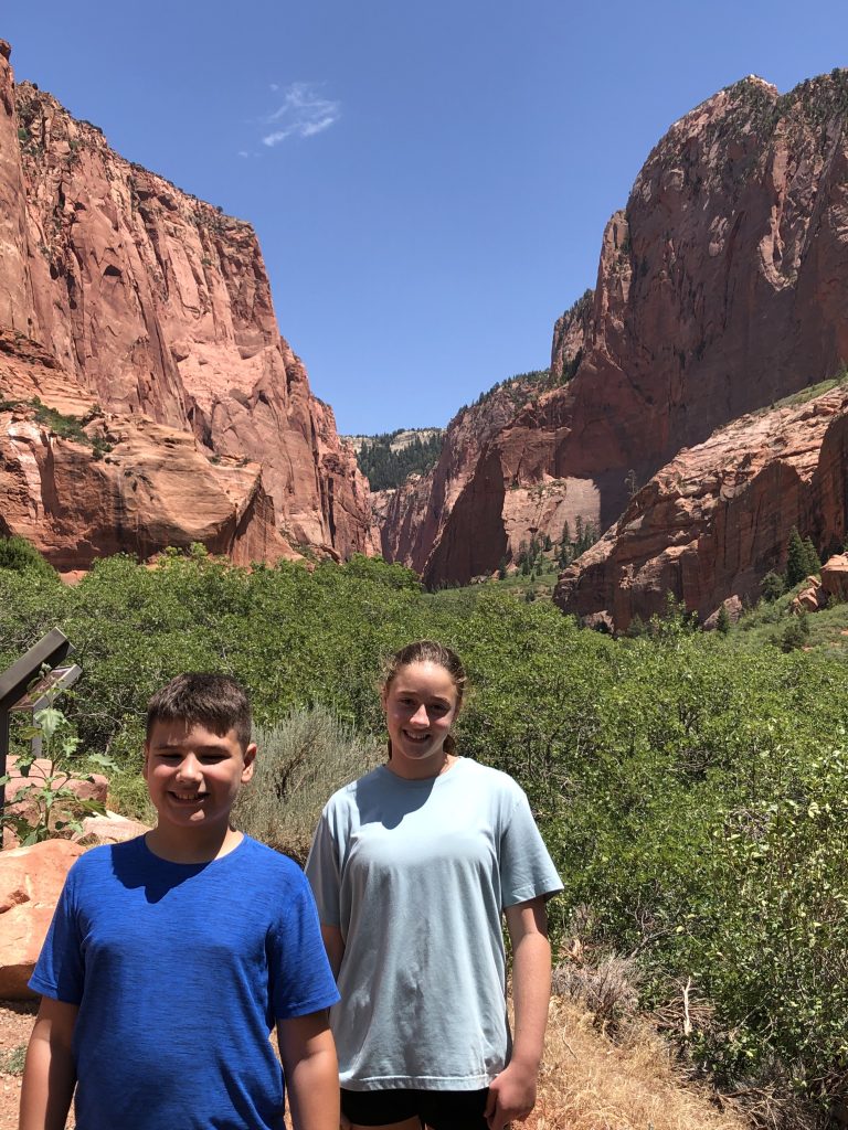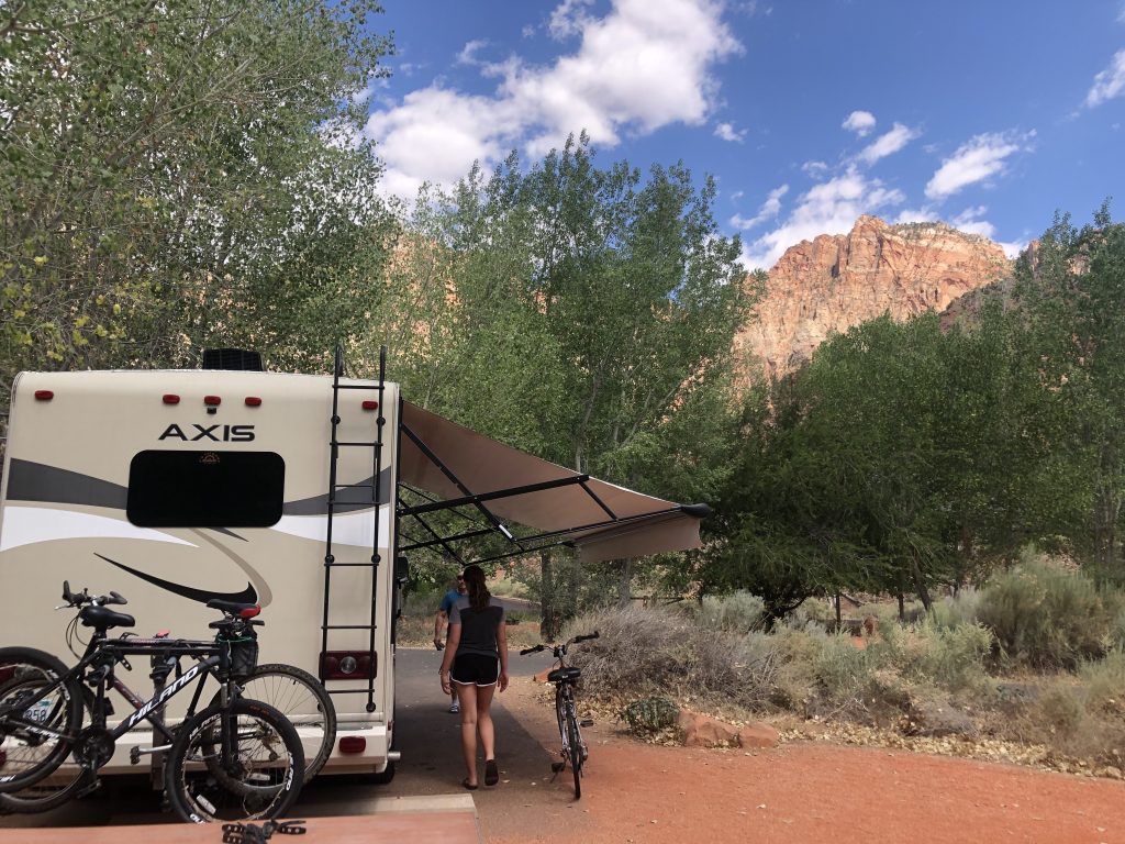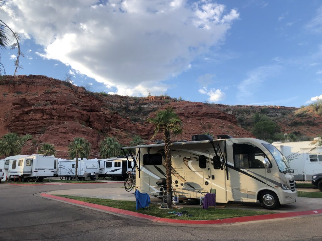 The next two nights we stayed in a small RV park in St. George. Most people there are long term residents but we still felt welcome and they have a beautiful mountain behind the park so you were still surrounded by mountains.  Hillside Palms RV Park  is 32 miles away from Zion. There are other RV parks around to choose from but we chose this one so we could explore the Red Cliffs Desert Reserve that was right behind us. We were able to ride our bikes there (up the hills so be ready for that) but be sure to visit this beauty when you go, we all had so much fun hiking around and they even have their own “Narrows” you can try to squeeze through.