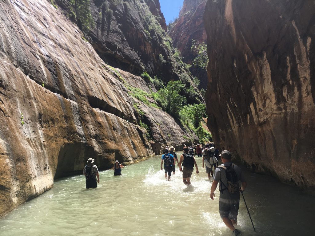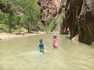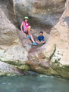 Next day we ate breakfast in the room and we packed up some P& J sandwiches for our long anticipated Hike in the Narrows. I packed up our water proof bags with a change of clothes, sandals, a small towel, water, and our lunches. We were all wearing our water shoes and bathing suit attire for the ride. At first the water was cool but as we progressed along, the water was cold! I believed we hiked no more than an hour before we were ready to turn around, we found a nice little cave flat spot to have our lunch before heading back to the entrance. I loved every minute of this, I didn’t get to hike it my first time in Zion so this was my first time getting to walk the water too. I’m glad I read about bridging a change of clothes so we were able to change into some dry clothes and sandals as we took on the long walk back to the tram line. After hiking the Narrows, we went on a few more small mini hikes before making our way out of the park for the night. Picked up some dinner once again and made our way back to the room; glad all our stuff was still there.